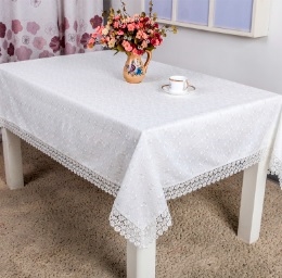 Скатерть выполнена под льняную ткань с органзой и кружевом. Невероятно нежный и красивый дизайн, который придаст вашему столу праздничный вид.Такая скатерть станет настоящим украшением вашего стола и сможет порадовать ваших близких в качестве прекрасного подарка на День рождения, 8 Марта, Новый Год и Рождество или свадьбу. Полиэстер – вид ткани, состоящий из полиэфирных волокон. Ткани из полиэстера – легкие, прочные и износостойкие. Уход: -Эта ткань устойчива к машинной стирке в холодной воде. -Стирать вещи из полиэстера следует со светлыми вещами. -Использовать режим бережной стирки. -Не отбеливать. -Гладить утюгом, регулятор которого установлен на минимум. Свойства полиэстера: -Этот материал не мнется. -Полиэстер легко стирается. -Данный вид ткани после стирки быстро сохнет. -Материал не растягивается и не садится.