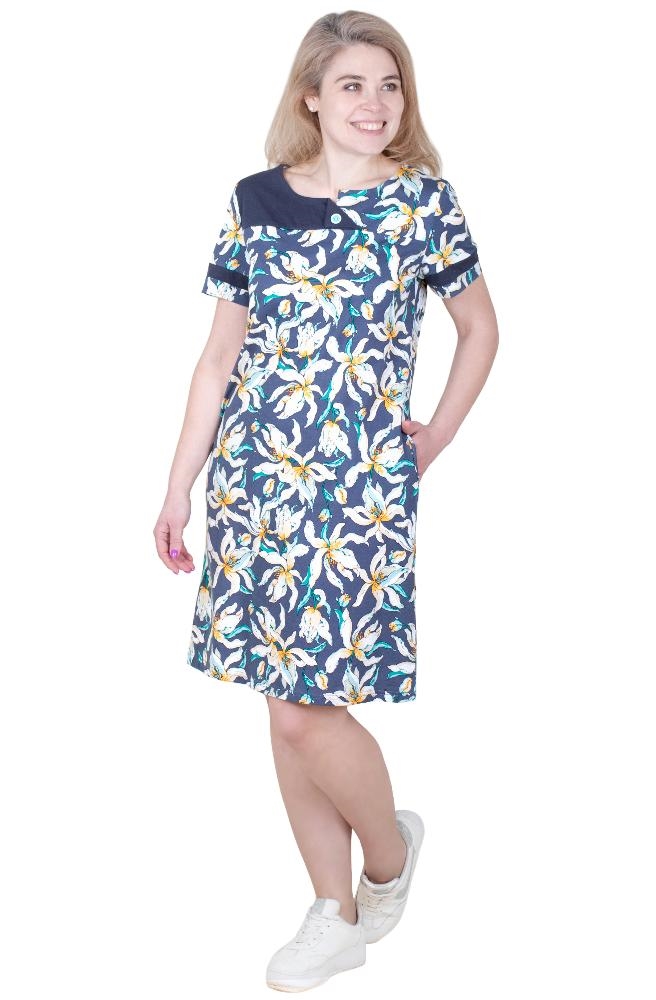 Туника из хлопчатобумажной ткани от производителя "ЛОТОС" (г.Иваново). Длина изделия немного выше колена, короткий рукав, на уровне бедер расположены карманы.